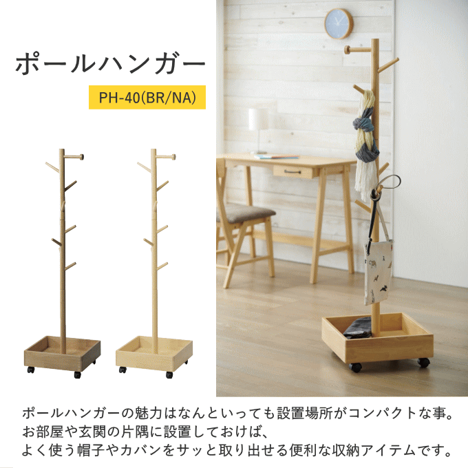 ポールハンガー 木製 おしゃれ 子供 キッズ 省スペース 北欧 PH-40 高さ 142cm 洋服掛け 帽子掛け 収納付き 天然木 スリム キャスター 新生活 弘益