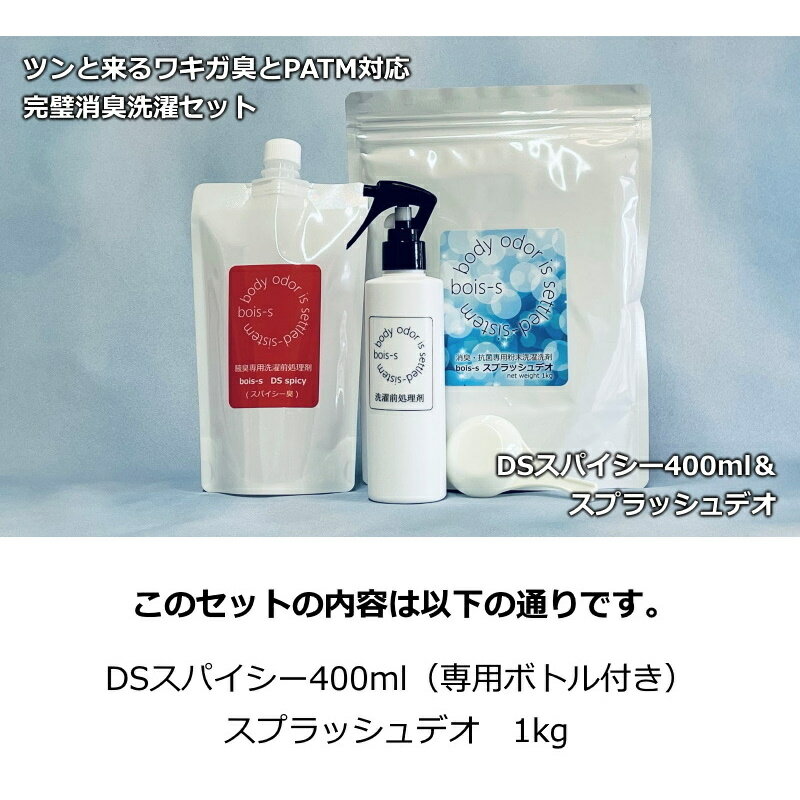 ツンとくるワキガ臭や周りのPATM反応に悩んでいる方!初めて買うなら全部揃った「消臭洗剤DSスパイシー+スプラッシュデオ+石鹸セット」をお試し下さい。