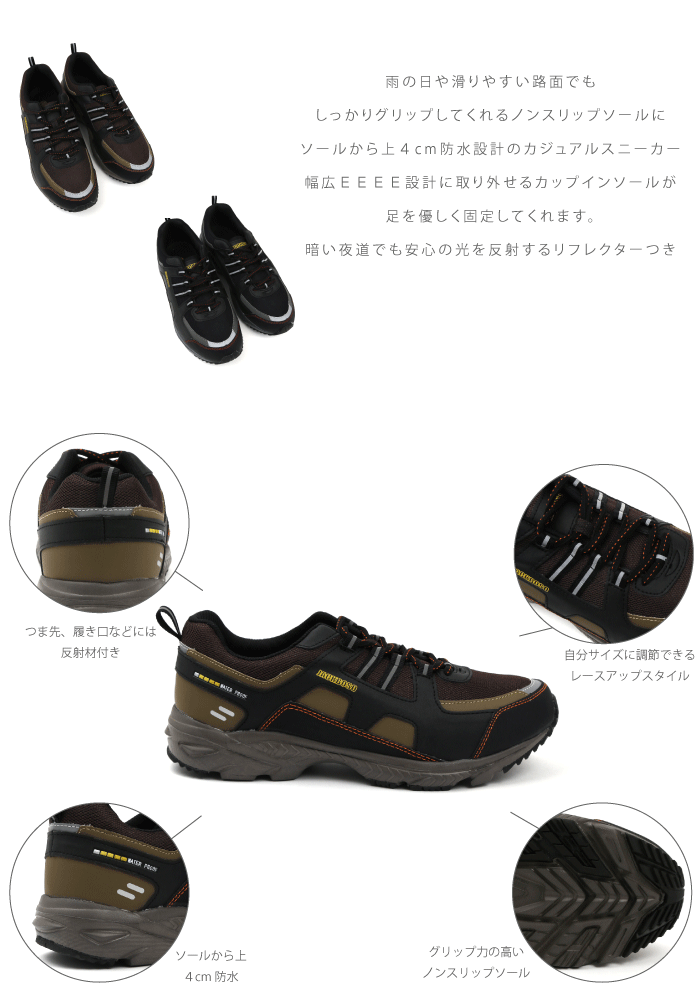 ■商品名ジャックボソ JACKBOSO 防水設計 反射材付き 幅広ワイズEEEE レースアップ スニーカー ■商品番号km1010 ■商品コメント雨の日や滑りやすい路面でも しっかりグリップしてくれるノンスリップソールに ソールから上4cm防水設計のカジュアルスニーカー 幅広EEEE設計に取り外せるカップインソールが足を優しく固定してくれます 暗い夜道でも安心の光を反射するリフレクターつき デイリーにもアクティブにも、使いまわし抜群の1足です ※こちらの商品はコンビニ受け取りの場合、お届けまでにお日にちを頂いております。
