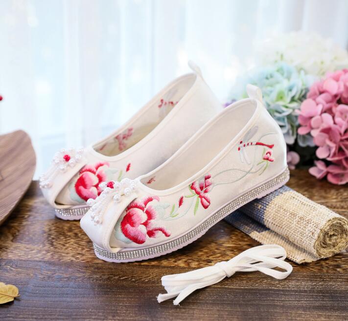 チャイナ靴 レディース用手作り刺繍 パール付きらきら綺麗なパンプス チャイナシューズ 中華コスプレシューズ 唐装漢服コスプレ専用靴 ダンス 舞台ステージシューズ