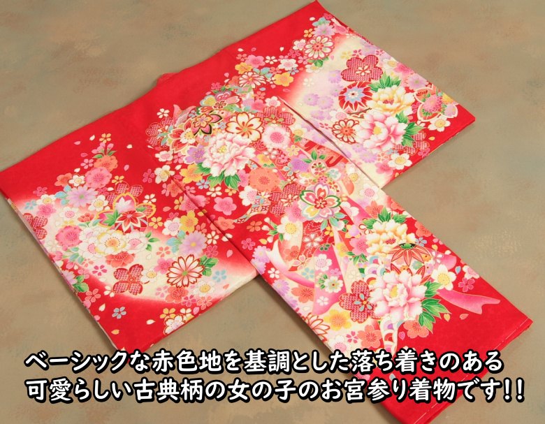 【送料無料】ベーシックな赤色地を基調としたお宮参り女の子の御着物です。